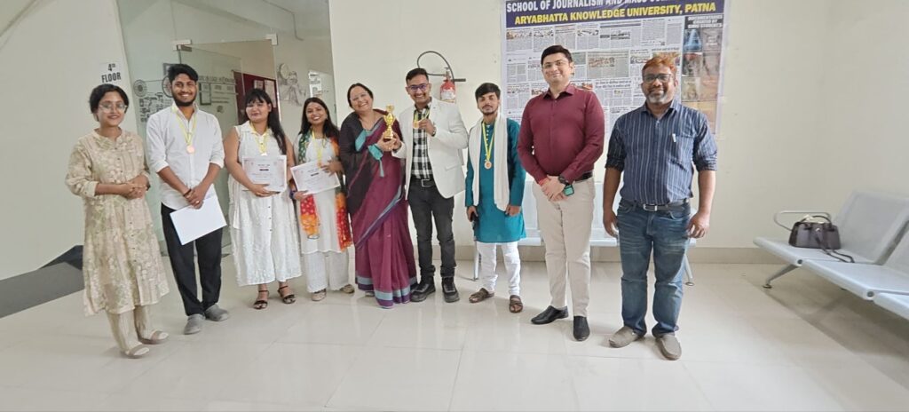 PATNA: आर्यभट्ट ज्ञान विश्वविद्यालय के विद्यार्थियों ने बिहार दिवस के अवसर पर श्री कृष्ण मेमोरियल हॉल में आयोजित नाटक, सामूहिक नृत्य तथा मेहंदी प्रतियोगिता में उत्कृष्ट प्रदर्शन करते हुए कई पुरस्कार अपने नाम किए। विश्वविद्यालय के स्कूल ऑफ जर्नलिज्म एंड मास कम्युनिकेशन के विद्यार्थियों ने नाटक प्रतियोगिता में तृतीय पुरस्कार प्राप्त किया। ‘ज्ञान का चश्मा’ शीर्षक से प्रस्तुत नाटक ने अपनी प्रभावशाली कहानी, सशक्त संवाद और जीवंत अभिनय के माध्यम से दर्शकों और निर्णायकों का मन मोह लिया। नाटक में सामाजिक सरोकारों को रोचक ढंग से प्रस्तुत किया गया, जिससे इसे विशेष सराहना मिली। इस नाट्य प्रस्तुति में एम.ए. जर्नलिज्म एंड मास कम्युनिकेशन प्रथम सेमेस्टर के छात्र-छात्राएं—सौरव, करण, रिया, मुस्कान, आनंद, दुर्गेश, राज नंदनी और विवेकानंद शामिल रहे।