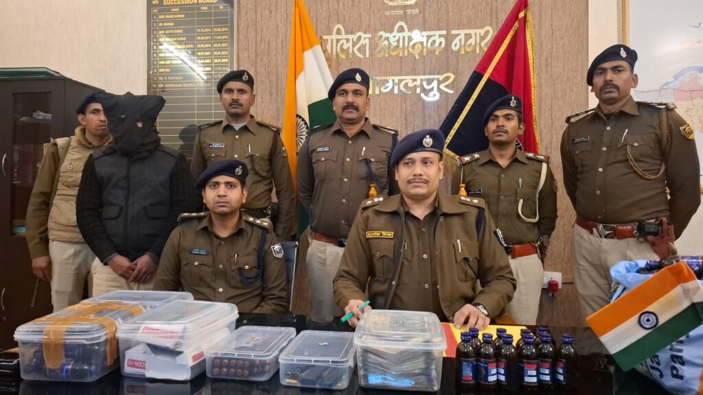 भागलपुर में पुलिस का बड़ा एक्शन: जिंदा बम, पिस्टल, मैगजीन, लाखों कैश और 155 बोतल नशीला सिरप बरामद, 2 गिरफ्तार